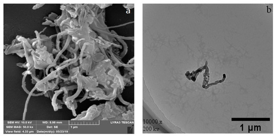 Figure 4a,e show the SEM images of WPI fibril–CNTs and WPI fibril–CNOs. The morphology of the dispersed CNTs and CNOs can be observed. The dispersion of WPI fibril–CNOs (Figure 4e) was better than WPI fibril–CNTs (Figure 4a), supporting the information in Figure 3. In the TEM images of WPI fibril–CNTs (Figure 4b) and WPI fibril–CNOs (Figure 4f), WPI fibrils and CNTs can be clearly observed; similarly, WPI fibrils and CNOs also existed. No obvious damage was observed in CNTs or CNOs after hybridization with WPI fibrils (Figure 4c,g). However, a significant reduction in the length of WPI fibrils in the composites can be seen in Figure 4d,h. The lengths of WPI fibrils were shortened from 2 μm to about 200 nm in both the WPI fibril–CNT and WPI fibril–CNO composites. The short fibrils formed small clusters. The possible reasons for this are as follows: (i) the destruction of the intermolecular force of the fibrils under steam pressure in the autoclave; (ii) the Brownian motion of carbon nanoparticles under pressure also might cause the WPI fibrils to break down; (iii) the β-folded fibril bundles near the turning point of WPI fibrils were distorted and destroyed [74,75]. These results indicate that under hydrothermal conditions, CNTs and CNOs might destroy WPI fibrils and inhibit further protein fibrosis. This finding might have important research value in the future in targeted therapy of organ fibrosis and in vivo protein fibrosis. By using molecule simulation, researchers reported that carbon nanotubes and fullerene prevented the secondary structure formation of amyloid-β peptide oligomers [76,77,78].