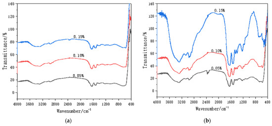 FTIR of WPI fibril–CNTs (or CNOs) (the concentrations of CNTs or CNOs were 0.05 wt.%, 0.1 wt.%, and 0.15 wt.%): (a) WPI fibril–CNTs; (b) WPI fibril–CNOs.