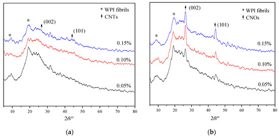 XRD patterns of WPI fibril–CNTs (or CNOs) (the concentrations of CNTs or CNOs were 0.05 wt.%, 0.1 wt.%, and 0.15 wt.%): (a) WPI fibril–CNTs; (b) WPI fibril–CNOs.