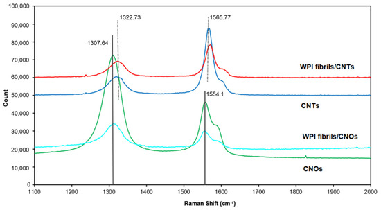 Raman spectroscopy is a useful nondestructive tool that can be used to study the structures of carbon nanomaterials [81]. Figure 7 presents the Raman spectra of the CNTs, WPI fibril–CNTs, CNOs, and WPI fibril–CNOs. The peaks were weaker in intensity after the composite process because the concentrations of CNTs and CNOs in the composites were lower. All four samples showed two main D band (around 1310 cm−1) and G band (around 1560 cm−1) peaks in the range of 1100 to 2000 cm−1. The D band represents various defects in the graphitic layers, such as stacking fault disorders between adjacent graphitic layers, edge defects, and atomic defects within individual graphitic layers [82]. The G band is due to the in-plane stretching vibrations of the sp2 graphitic carbon. In highly oriented pyrolytic graphite (HOPG), with an increase in the defect in the graphitic materials, the D-band becomes intense [83]. The intensity ratio of D and G bands (ID/IG) can be used as a measure of the degree of disorder in the carbonaceous materials. In an ideal graphite nanomaterial, the D band is weaker and the G band is stronger and sharper, indicating a higher degree of long-range order and a lower impurity level [84]. From the spectra for CNTs and WPI fibril–CNTs, the D band was at 1322.73 cm−1 and the G band was at 1565.77 cm−1. It was clear that the ID/IG in CNTs (ID/IG CNTs = 0.49) was smaller than that in WPI fibril–CNTs (ID/IG WPI fibril–CNTs = 0.79). This indicates the existence of more defects in the WPI fibril–CNT sample, whereas for CNOs and WPI fibril–CNOs, the D band was at 1307.64 cm−1 and the G band was at 1554.10 cm−1. The ID/IG for CNOs (ID/IG CNOs = 2.39) was larger than for the WPI fibril–CNOs (ID/IG WPI fibril–CNOs = 2.14), meaning unlike in the case of CNTs, after hybridization there were fewer defects in WPI fibril–CNOs. Some defective graphite layers in CNOs might be removed. Making a comparison between CNTs and CNOs, we found that the ID/IG in CNTs was smaller than that in CNOs, indicating the existence of more defects in CNOs than in CNTs. The HR-TEM images clearly indicated that some graphite shells in CNOs were not fully closed, supporting the existence of more defects.