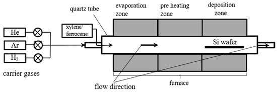 The Linde gas cylinders were applied and argon and helium with a purity of 99.9% were used. Hydrogen was produced in the electrolysis process in a Linde HiQ H2 FID hydrogen carrier gas generator. Dosing valves and flowmeters were used to regulate the mass flow of gases. Injection pump Medima S2 was employed to dose the catalyst solution. The tube furnace was divided into three zones. Each zone could be regulated independently in the temperature range up to 1050 °C. The first zone was responsible for the preheating of gases and catalyst vaporization. In the second zone, neutral gases and iron particles were heated to the adjusted temperature. The last zone was the deposition zone where carbon nanotubes were formed and deposited on the substrate. As a substrate, a silicon wafer was used. As an exhaust gas system, a barbotage column and ventilation pump were used. Figure 1 shows the scheme of the process.