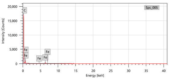 Moreover, the chemical composition of the samples was tested in the middle of the carpet height and on the top. Both examinations resulted in showing the carbon and iron atoms in the structure of the nanotubes. For this sample, the EDS resulted in Fe contamination at the level of 9.74 ± 0.18 wt%. Furthermore, a higher content is obtained on the top of the carbon nanotubes, which indicates a “tip up” growth mechanism. The examination also proves the iron content in synthesized carbon nanotubes, which is the basis of the medical application of the obtained material.