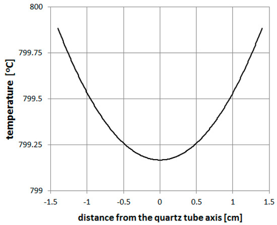 To calculate the temperature distribution in the quartz tube in the reaction zone, a FEMM software was used. In Figure 9, it can be seen that in the case of a small diameter of a quartz tube (<30 mm) the difference between the wall temperature and temperature in the tube axis does not exceed 1 °C.