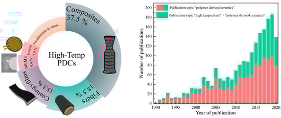 High-temperature-polymer-derived ceramics (PDCs) for different applications (left). Publication topics on the keywords “polymer derived ceramics” and “high temperature + polymer derived ceramics” (right). Data obtained from 1990 to September 2020 on from ISI web of science.