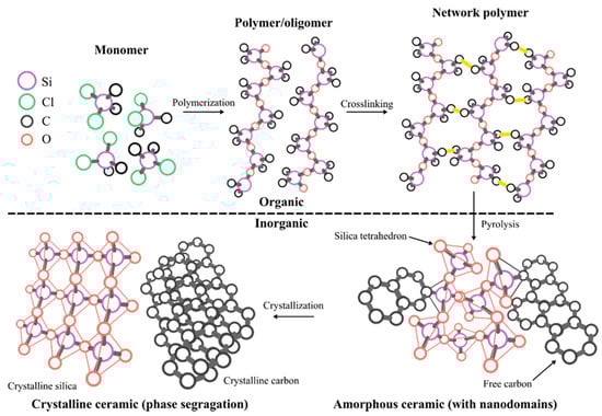 As previous studies have shown, the phase, microstructures, thermal stability, and high-temperature behaviors of synthesized ceramics can be modified by incorporating different types of hetero-elements into the Si-based precursors at the molecular level. Figure 3 shows the phase separation and thermal decomposition of various Si-based PDCs at elevated temperatures.