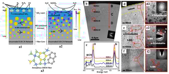 (a) Schematics of SiBCN fiber microstructures (a3) with a detailed illustration of the formation of two additional surface layers after annealing in (a1) air and (a2) imitated combustion environment. (b,d–f) Transmission electron microscopy (TEM) images of fiber cross-section showing different layers. (c) EDS data obtained from the marked area in (b). Reproduced with permission [42]. Copyright 2018, American Chemical Society.