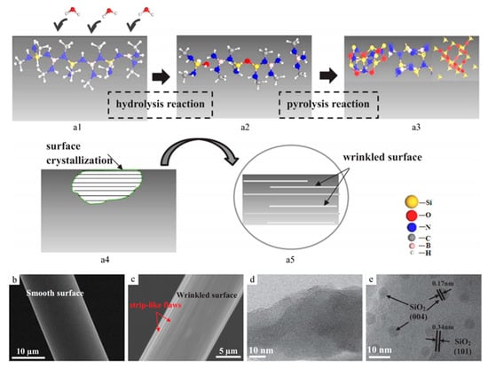 As mentioned, excessive carbon in PDC structures often causes reduced thermal stability of the system due to direct oxidation in air or a reaction with other phases to form crystalline structures. Recent studies on a novel ternary system with only Si, B and N have shown an applicable synthesis of Si-based, carbon-free ceramic fibers from polyborosilanes. Specifically, the ceramics were synthesized from precursors without carbon. For example, Cl3Si-NH-BCl2 can crosslink into oligomers or polymers via polycondensation in NH3, and additional pyrolysis produces C-free SiBN ceramics, which have theoretical thermal stability up to 1700 °C. However, this type of precursor requires handling in a dry inert atmosphere due to hydrolysis reactions of the precursors with moisture. Liu et al. studied the hydrolysis effect of polyborosilazane on SiBN ceramic fibers, demonstrating evidence of the formation of Si-O-Si groups in the precursor (Figure 5) [43]. The incorporated oxygen altered the surface features of pyrolyzed PDC fibers and caused the formation of β-SiO2 at 1400 °C, leading to decreased thermal stability due to early crystallization.