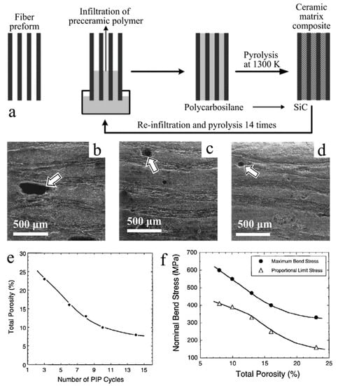 (a) Schematics of the polymer impregnation and pyrolysis (PIP) process [48]. SEM images of cross-sectional view of SiC/SiC composite after PIP cycle of (b) 3, (c) 8 and (d) 14. Plots of (e) total porosity vs. the number of PIP cycles, and (f) nominal bending stress vs. total porosity. Reproduced with permission [44]. Copyright 2004, John Wiley and Sons.
