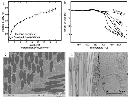 (a) Plot of relative density vs. number of impregnation cycles. (b) TGA curves of bulk and powdered SiBCN, Cf/SiBCN composite and calculated Cf/SiBCN. SEM images of (c) as-prepared crack-free interface, (d) crack propagated interface [50]. Copyright 2008, Elsevier.