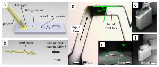 Schematics of shaping process of precursor for microelectromechanical systems (MEMSs), (a) mold filling, and (b) crosslinking and pyrolysis of samples. Optical microscopy of (c) mold filling process, (d) precursor drop on the mold surface. SEM images of (e) crosslinked sample and (f) pyrolyzed sample. Reproduced with permission [54]. Copyright 2008, Elsevier.