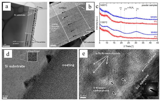 TEM images of (a) as-prepared SiCN multilayer coating on Si substrate pyrolyzed at 1100 °C and (b) SiCN multilayer coating on SiC substrate annealed at 1400 °C. (c) XRD of SiCN as-prepared and annealed samples, both showed amorphous structures. High-res TEM images of (d) as-prepared sample on Si substrate and (e) annealed sample on SiC substrate. Reproduced with permission [60]. Copyright 2015, Elsevier.