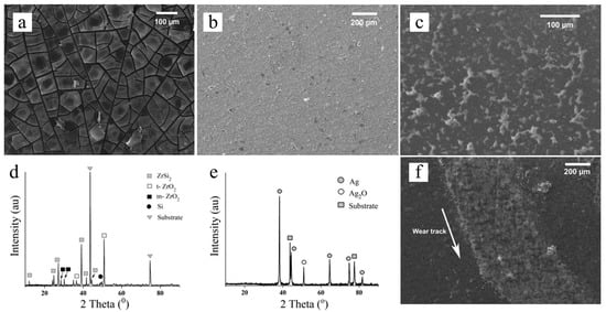 SEM images of (a) neat pyrolyzed SiOC ceramic coating with obvious cracks, (b) pyrolyzed SiOC-ZrO2 coating and (c) pyrolyzed SiOC-Ag coating at 700 °C. XRD spectra of (d) pyrolyzed SiOC-ZrO2 sample and (e) pyrolyzed SiOC-Ag sample, where both showed phase oxidation of incorporated particles into ZrO2 and Ag2O. (f) SEM image of wear track of SiOC-ZrO2 sample with a sliding distance of 18 m at a load of 3 N. Reproduced with permissions [59]. Copyright 2018, Springer Nature.