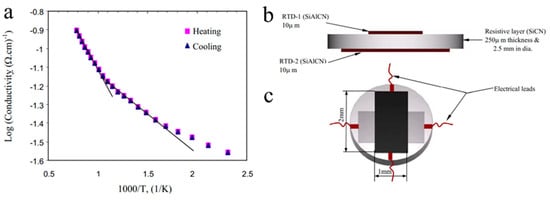 (a) Semiconducting behavior of SiAlCN indicated by the changing electric conductivity at different temperatures. Schematics of the design of heat-flux sensor of PDC materials, (b) sectional view and (c) top view. Reproduced with permission [61]. Copyright 2006, IOP Publishing.