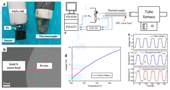 (a) Optical images of SiAlCN sensor attached to alumina rod via Pt wires and thermocouple for comparison. (b) SEM images of a cross-section of sensor head showing the interface between SiAlCN ceramic phase and Pt wire. (c) Schematics of temperature measurement testing setup. (d) The output voltage of the temperature sensor as a function of temperature. (e) The response of the temperature sensor to the changes of environmental temperature, and the comparison to thermal couple measurement. Reproduced with permission [63]. Copyright 2014, Elsevier.