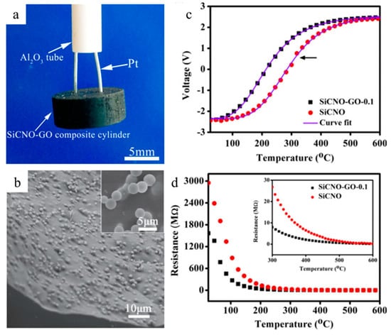 (a) Image of SiCNO-GO sensor. (b) SEM images of SiCNO-GO (1 wt.% GO) sensor with a magnified image (inset). (c) The voltage output of the sensor at the temperature range from 25 to 600 °C. (d) The resistance of probe material vs. temperature. Reproduced with permission [64]. Copyright 2016, John Wiley and Sons.