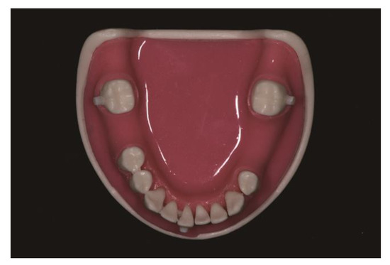 Mandibular typodont (CIBM01, Osstem, Busan, Korea) used in the present study. Radiopaque markers (Tetric N-Ceram, Ivoclar Vivadent, Schaan, Liechtenstein) were attached to the buccal surfaces of the bilateral second molars and the labial surface of the right central incisor.