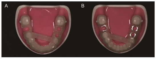 3D-printed computer-assisted implant surgical guides fabricated with a 3D printer (NextDent 5100, 3D Systems, Rock Hill, SC, USA) and a resin material (NextDent SG, 3D Systems). (A) Metal sleeve-free surgical guide (MSF group). (B) Metal sleeve-incorporated surgical guide (MSI group).