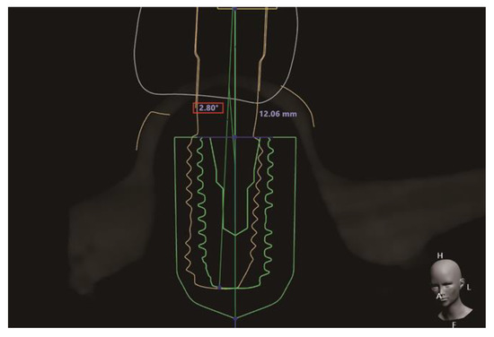Scan bodies (TSSBM and TSBS, Osstem) were connected to the three implants on each typodont, scanned with a tabletop scanner (T500), and saved as an STL file. An extra 4.0 mm diameter implant and an extra 5.0 mm diameter implant were prepared and connected to the corresponding scan body individually and then scanned using the same tabletop scanner. The files were then saved in STL format. The implant-scan body assembly was superimposed over the typodont with scan bodies connected by means of the common part, using the best-fit alignment function in CAD software. This enabled the presentation of implant fixtures on the STL file of the typodont and was saved as another STL file. This STL file was re-imported into the same implant-planning software program [29]. The angulation between the preoperative and postoperative stages of the implant was measured from both the mesiodistal and buccolingual perspectives (Figure 3).