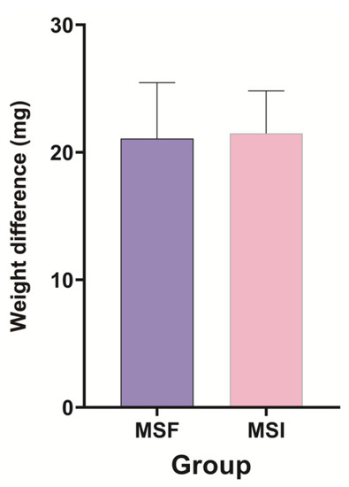 Preoperative and postoperative weight differences of the MSF and MSI groups. No statistically significant differences were observed. Data are expressed as mean ± standard deviations.