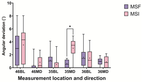 Preoperative and postoperative angular deviations of the MSF and MSI groups. The lines inside the boxes indicate median values, and the cross signs inside the boxes indicate mean values. The borders of the boxes indicate the 25th and 75th percentiles. The whiskers indicate the minimum and maximum values. The statistically significant difference is marked with an asterisk (p < 0.05). BL, buccolingual. MD, mesiodistal.