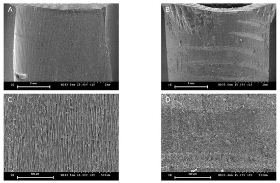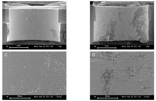 Representative scanning electron microscopic images. Cross-sectional view of a sleeve insert from a preoperative (A) and a postoperative (B) image from the MSF group in a lower magnification (18×). Cross-sectional view of a sleeve insert from a preoperative (C) and a postoperative (D) image from the MSF group at a higher magnification (80×).