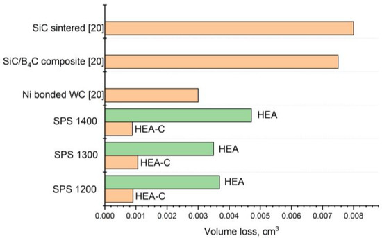 Simultaneously, the presence of the fine-grained Laves phases protects the surface from strong plastic deformations and prevents destructions during a sliding, while the BCC solid solution of high plasticity protects the surface from a brittle fracture. The increase of the SPS temperature results in a decrease of the Laves phase content in the samples. The Laves phase grains coarsen, leading to higher wear under the tests. The higher characteristics of the carburized layer probably result from the BCC-lattice strain caused by the intercalation of carbon atoms and the fine-dispersed HEA carbides. The difference in the wear rate for the carburized layer and the bulk HEA corresponds to the Archard wear equation. According to the equation, sliding wear resistance is proportional to the alloy hardness. The difference between the values for the carburized layer and the bulk HEA is 300%, indicating the superior wear resistance of the carburized layer compared to the conventional hard alloys. The bulk HEA exhibits wear resistance higher than a sintered SiC, or SiC/B4C composite does.