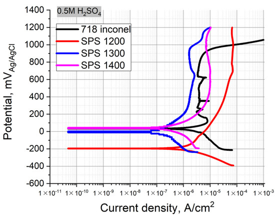 Figure 6 represents the polarization curves for the CrMoNbWV HEA SPS-samples in the 0.5 M H