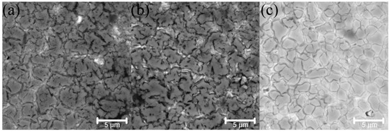 Figure 2c). In this case, the Laves phases partially dissolve in the matrix, and the oxides coagulate and localize along the recrystallized grain boundaries. It is worth noticing that the increase of the sintering temperature led to changes in oxide morphology: it became circular instead of splintery (polyangular).
