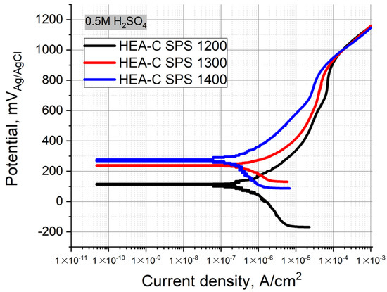 Figure 8 represents the Tafel polarization curves obtained for the carburized layer of the HEA SPS-samples. The electrolyte was the 0.5 M H