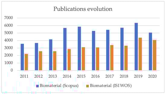 Evolution of the number of publications on Scopus and ISI Web of Knowledge containing “biomaterial” during the period 2011–2020.