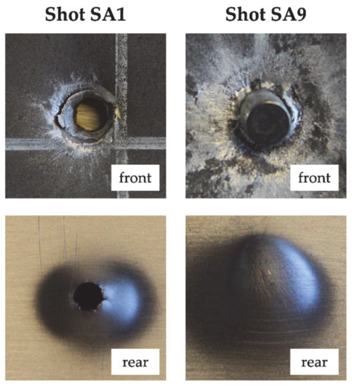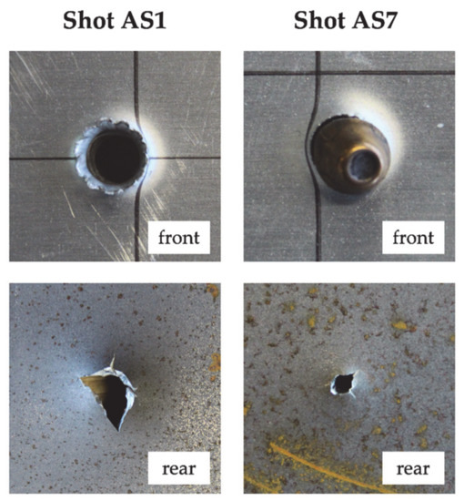 Regarding target AS, the residual velocity of shot AS8 was not measured due to an error of the speed trap, while the residual velocity of shot AS9 was significantly lower than for other shots at a similar impact velocity, possibly due to inclined impact. For these reasons, shots AS8 and AS9 were not considered in the interpolation of the Lambert–Jonas equation. The computed ballistic limit velocity was 438.54 m/s. The projectile jacket remained stuck in the front aluminum layer which exhibited petaling in the front face and plastic deformation. The rear steel layer showed significant bulging and bending deformation. The hole in the rear steel plate was circular except for shots AS1, AS2 and AS3, which were characterized by the highest impact velocities (between 622.73 and 833.3 m/s), for which the hole exhibited significant fragmentation (see Figure 3). For shots AS5 and AS6 (low measured residual velocity), part of the hardened steel core remained stuck in the front aluminum plate but some fragments were able to perforate the rear steel plate and a residual velocity was measured by the speed trap. For shot AS8, almost all the core remained stuck in the front aluminum plate. A small hole was visible in the rear steel plate (see Figure 3), with a diameter of approximately 2 mm but no moving object was detected by the rear speed trap.