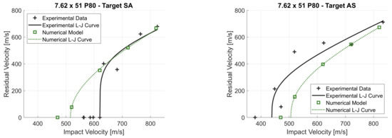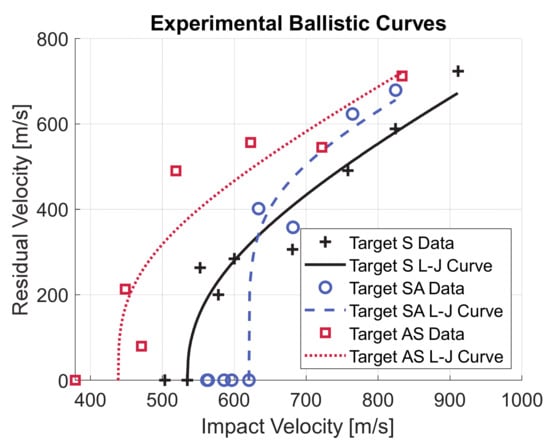 Ballistic curves were fitted, by means of the method of least squares, through the experimental points with the Lambert–Jonas equation [37] defined in Equation (1)