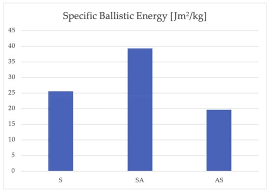 The fitted ballistic curves are reported in Figure 4. At the nominal impact velocity, target S shows the best performance since the projectile residual velocity is 588.61 m/s. However, the areal density of target S is slightly higher than the other two targets. Target SA performs slightly better than target AS since for the former the residual velocity is 679.14 m/s while for the latter it is 712.17 m/s. A different observation can be made if the impact velocity is lower, around 600 m/s. Target SA is able to stop the projectile at an impact velocity of 620.43 m/s while target S, despite its higher areal density, is completely perforated at an impact velocity of 600.15 m/s (the residual velocity is 284.39 m/s). Target AS is the worst configuration with a residual velocity of 556.39 m/s for an impact velocity of 622.73 m/s. The specific ballistic energy for the three configurations is shown in Figure 5. Target SA shows considerably higher ballistic limit velocity than target S, while the areal density is slightly lower. Consequently, the specific ballistic energy of target SA is 54% higher than the specific ballistic energy of target S. On the other hand, the specific ballistic energy of target AS is 23% lower than of target S.