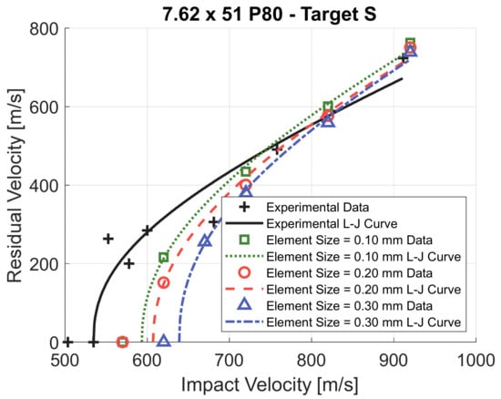 The authors already determined the elastic modulus E, the Johnson–Cook parameters A, B and n, and the Cockcroft–Latham parameter Wc for AA66061-T6 [41]. The other material parameters were obtained from the literature. Herein, the material model, already used in [41], is further validated by replicating the experimental tests performed by Piekutowski et al. [45] were an ogive-nose steel projectile was impacted against a 26.3 mm thick AA6061-T651 plate. An axisymmetric numerical model which replicates the experiment was built. The projectile had a radius of 12.9 mm (for more details the reader is referred to [45]) and MAT_003—Plastic Kinematic [39] was used. An elastic modulus of 202,000 MPa and a yield strength of 1430 MPa were used, which were reported in [45]. The mesh average size of the projectile was 0.3 mm. The radius of the target was 152 mm and encastre boundary conditions were applied at the outer edge. MAT_107—Modified Johnson–Cook was used [39] with the material parameters reported in Table 5 used for the target. Different mesh element sizes were adopted, ranging from 0.3 to 0.5 mm, to perform a mesh convergence analysis. The results are reported in Figure 11. The numerical model replicated the experimental results with high accuracy and convergence of the results obtained.