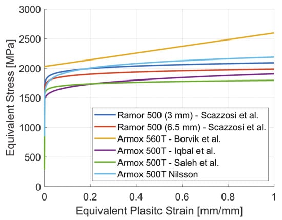 Ramor 500 is a high-strength steel commonly used in ballistics shields design. According to the manufacturer datasheet, the perforation resistance of Ramor 500 is similar to another steel from the same manufacturer, which is ARMOX 500. Indeed, for both steels, a thickness of 6.5 mm and 14.5 mm is required to obtain respectively a FB6 and FB7 protection level defined in EN 1522 [36]. The authors already determined the elastic modulus E, the Johnson–Cook parameters A, B and n, and the Cockcroft–Latham parameter Wc for Ramor 500 [35]. The Johnson–Cook static flow stress rule of Ramor 500 [35] is compared with ARMOX 500T [28,29,44] and ARMOX 560T [1] in Figure 8. Ramor 500 shows a similar static flow rule of ARMOX 500T. Since the authors were unable to identify the Johnson–Cook strain hardening parameter C and thermal softening parameter m for Ramor 500, they were assumed to be similar to the other high strength steels reported in Figure 8.