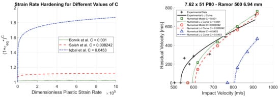 As shown in Figure 9a, the values reported in the literature for the parameter C vary in a large range, between 0.001 and 0.0453 [1,28,29,44]. Iqbal et al. [29] determined a value of 0.0453. This value is much higher than values obtained by other authors and leads to high strain hardening. As a result, if C = 0.0453 is considered, the numerical model considerably overestimates the perforation resistance of target S, as shown in Figure 9b. By decreasing the value of C, the perforation resistance predicted by the numerical model decreases and the value of C = 0.001, found by Borvik et al. [1], leads to the highest accuracy.