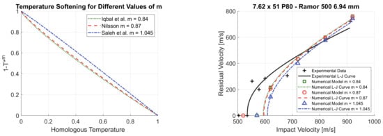 The values reported in the literature for the parameter m vary in the range between 0.84 and 1.045 [1,28,29,44]. As shown in Figure 10a, the thermal softening remains largely unaffected if the parameter m remains within this range. Considering the maximum and the minimum value of m, the maximum difference in the thermal softening rule () is 12% and is obtained at T* = 0.34. Therefore, the perforation resistance predicted by the numerical model is slightly affected by the value of m, as shown in the parametric study of Figure 10b. The perforation resistance slightly decreases if the value of m decreases. The highest accuracy is obtained with the value of m = 0.84, determined by Iqbal et al. [29].