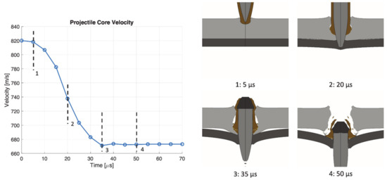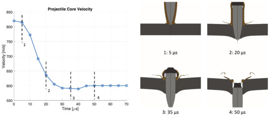 The perforation process in target S at 820 m/s impact velocity is shown in Figure 13. The lead end and the brass jacket are almost completely destroyed during the impact, while the hardened steel core is only subjected to minimal erosion of the tip. After 20 µs the hole is opened at the rear face of the plate but the projectile core is still subjected to deceleration since it has to enlarge the hole to achieve complete perforation. After 50 µs, the core reaches a constant velocity.