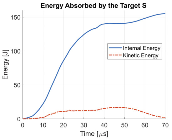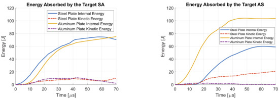 The energy absorbed by the target S at 820 m/s impact velocity is shown in Figure 14. Since the plate is subjected to limited bending deformation, but only localized plastic deformation up to failure, most of the absorbed energy is converted into internal energy of the target.