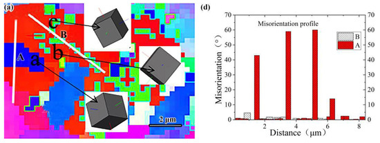 Figure 6a–c was obtained by magnifying the grain boundary orientation pattern five times. Line A and B calibrate the orientation between cementite and ferrite and adjacent ferrite. In order to further analyze the grain formation mechanism of the samples in three states, the orientation of three adjacent grains was extracted by Channel 5 software. The three-dimensional display function of the software was used to simulate the three-dimensional images of these grain orientations, so as to understand the grain orientation characteristics more intuitively, as shown in Figure 6a–c, where a and b represent ferrite and c represents cementite.