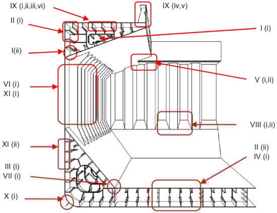The bulk carrier structural elements most prone to cracks are shown in Figure 1. According to the classification of the US Ship Structure Committee, these elements are located in area IX (ii)—“Fractures in deck plating around access manholes.” These cracks are the subject of the analysis in this article. Detailed information about all areas presented in the figure is provided in the US Coast Guard document [37].