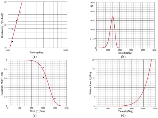 The analysis carried out with Weibull++ 9.0 (ReliaSoft Synthesis, HBM Prenscia, Tucson, AZ, USA) enabled us to plot the most important reliability characteristics [54,55], shown in Figure 3. For the analyzed population data, the scale parameter was 1429.74 days, and the shape parameter was 7.91.