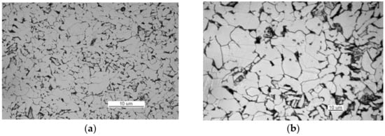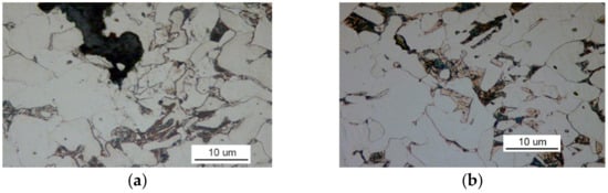 Figure 8b shows that the examined material has a ferrite structure with a small amount of severely-degraded pearlite. At the boundaries of ferrite grains, an intermittent cementite network is visible.