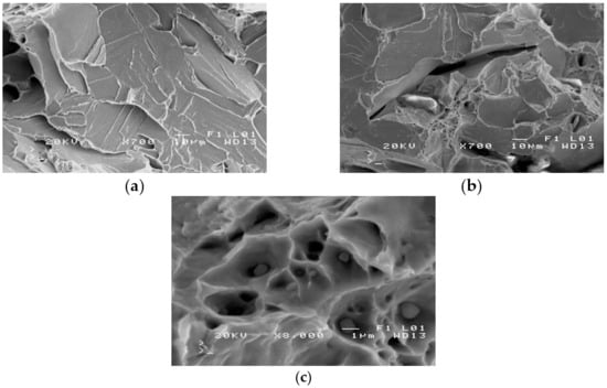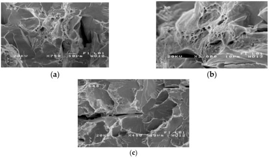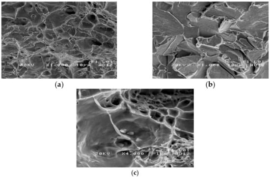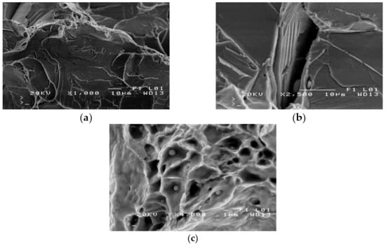 Scanning electron microscope (SEM) views: (a) a fracture with a mixed structure.; (b) plastic fracture with a crater-like structure; and (c) brittle fracture obtained at −40 °C (handy-size bulk carrier 30182 DWT).