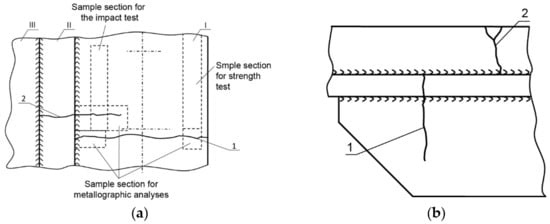 - Mechanical properties examination included static tensile tests and impact tests. Static tensile tests were conducted in accordance with the standard PN-EN 10002 [59]. Impact tests were conducted in accordance with PN-EN 10045-1 [60], PN-EN 10045-2 [61] and PN-79/H-04371 [62]. The standards PN-EN 10045-1 and PN-79/H-04371 are commonly used for this type of testing, and the values given therein do not differ significantly from those required by classification societies;