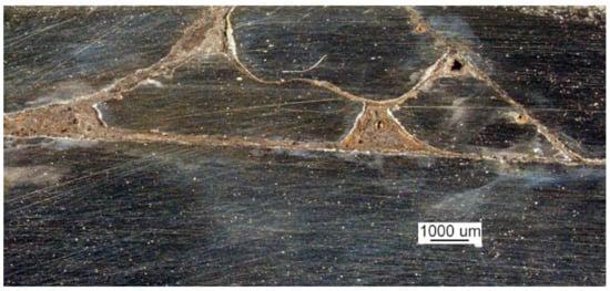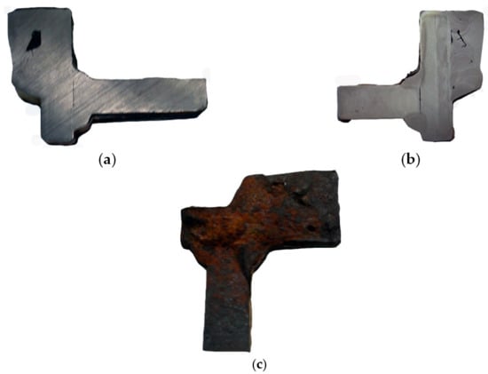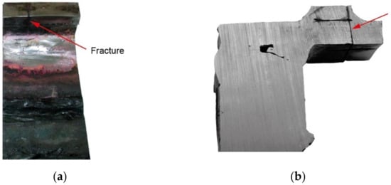 A cross section of the joint between the two elements is shown in Figure 13b. The right part in Figure is element II, and the left part is the remainder of the cut-off element I. In the cross-section shown, both elements are virtually not welded together. The joints concerned are similar to two other cross-sections made at a distance of about 100 mm and 120 mm from the first section. In the condition of the area being examined, element I acts independently of the entire manhole structure—they do not form a whole. Because element I is not reinforced by other structural components in this section, it undergoes significant local strain due to the work load. This probably initiates cracking on edge A, although massive corrosion on the fracture surfaces makes it impossible to pinpoint the origin of the crack. The crack extends towards element II, but it does not create another crack since there was no connection between them. It then passes through the weld and exits (Figure 13c).