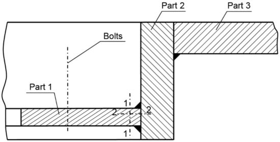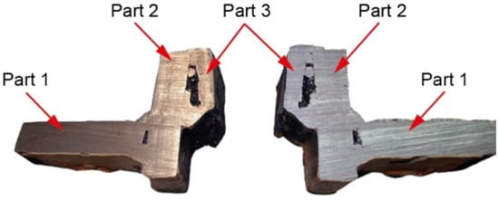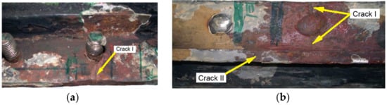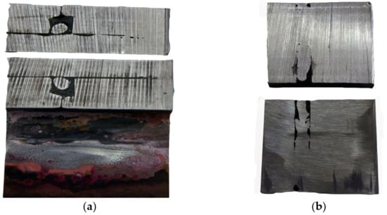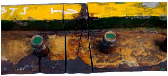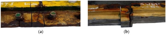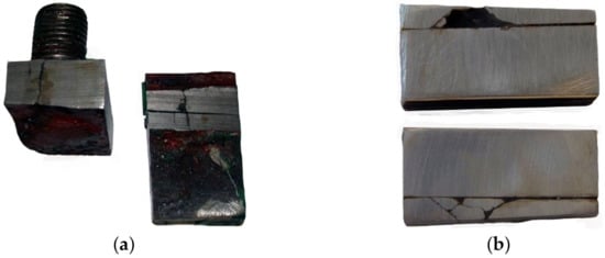 Figure 10 shows two cracks, also numbered 1 and 2 in Figure 12a,b. Crack 1 probably originates on edge A of element I and runs next to the bolt toward element II. Crack 2 originates on edge C of element II (Figure 11). To analyze crack 1, a bar of the plate (12 mm in size, perpendicular to parts I and II) that contained crack 1 was cut out. Figure 13a shows the sample obtained after cutting off a large part of the cracked element I.