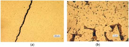 Microscopic examination was performed for the front of the crack that originated at the edge of the manhole. A metallographic specimen was made by merely polishing the piece using diamond pastes with 9 µm and 3 µm grain. Figure 7a shows a crack filled with corrosion products.