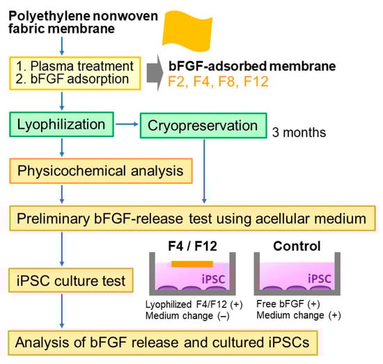 - Oyane, A.; Araki, H.; Nakamura, M.; Aiki, Y.; Higuchi, K.; Pyatenko, A.; Adachi, M.; Ito, Y. Controlled release of basic fibroblast growth factor from a water-floatable polyethylene nonwoven fabric sheet for maintenance culture of iPSCs. Rsc Adv. 2020, 10, 95–104. [Google Scholar] [CrossRef]