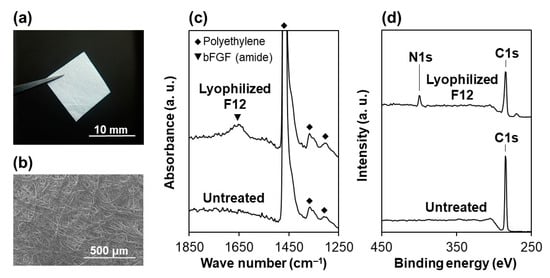 As depicted in Figure 2a, the lyophilized F12 membrane is a free-standing sheet and easy to handle with tweezers. We observed that this membrane is comprised of randomly oriented nonwoven microfibers and possesses a porous structure (Figure 2b), corresponding to the manufacturer’s product information sheet. The contact angle of a water droplet on this membrane was 33.9 ± 7.7°, which is comparable to that on a plasma-treated membrane (38.9 ± 5.9° [18]). This result indicates that the wetting property of the plasma-treated membrane was retained in the lyophilized F12 membrane. In the FT-IR spectra (Figure 2c), a peak ascribed to bFGF (amide group) was detected for the lyophilized F12 membrane, whereas it was hardly detected for the untreated membrane. The FT-IR spectrum of the lyophilized F12 membrane was similar to that of the non-lyophilized (air-dried) F12 membrane [18]. In the XPS spectra (Figure 2d), the N1s peak, a component element of bFGF, was clearly detected for the lyophilized F12 membrane (N/C elemental ratio = 0.11 ± 0.01), whereas nitrogen was under the detection limit for the untreated membrane (N/C elemental ratio < 0.001). These results suggest the presence of bFGF on the lyophilized F12 membrane.